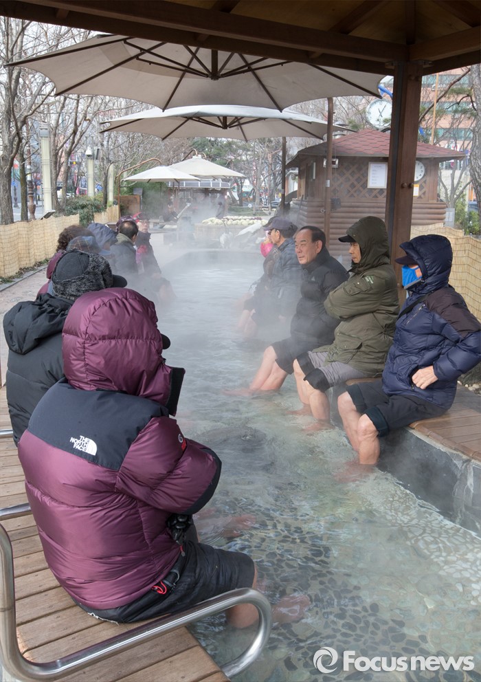 (대전=포커스뉴스) 절기상 대한인 21일 오전 대전 유성구 족욕체험장에서 영하의 강추위에도 불구하고 시민들이 온천수에 발을 담그고 몸을 녹이고 있다.