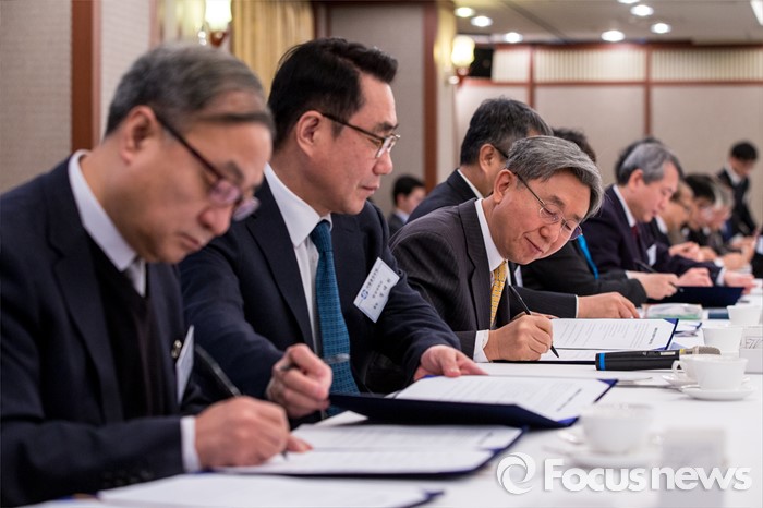 (서울=포커스뉴스) 21일 오전 서울 중구 프레스센터에서 열린 '제4회 서울 총장 포럼'에 자리한 서울 지역 대학 총장들이 국제적 경쟁력 확보 및 예산 절감, 대학의 재정적 위기상황 공동대응, 교육프로그램 공유 등이 담긴 '서울 총장 포럼 회원대학 학술교류협정서'에 서명을 하고 있다.