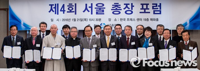 (서울=포커스뉴스) 21일 오전 서울 중구 프레스센터에서 열린 '제4회 서울 총장 포럼'에 자리한 서울 지역 대학 총장들이 국제적 경쟁력 확보 및 예산 절감, 대학의 재정적 위기상황 공동대응, 교육프로그램 공유 등이 담긴 '서울 총장 포럼 회원대학 학술교류협정서'에 서명을 마친 뒤 사진촬영을 하고 있다.