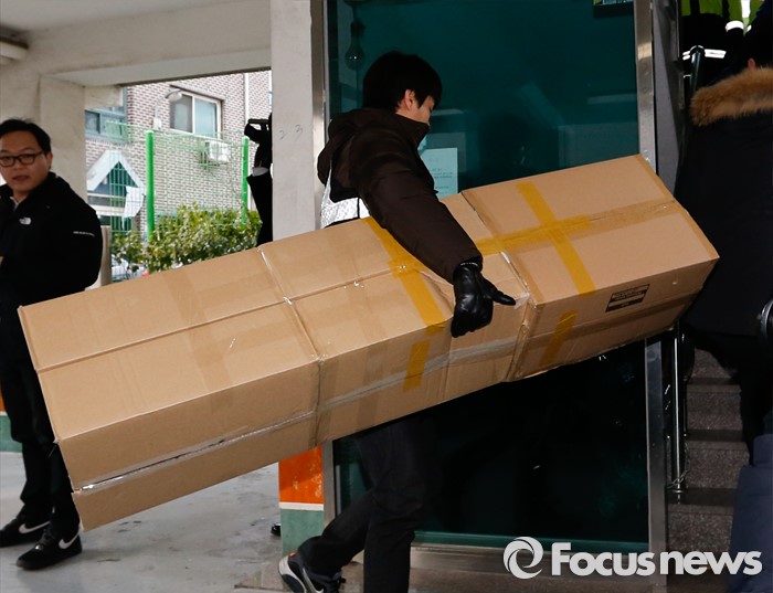 (부천=포커스뉴스) 부천 초등생 살해사건의 두번째 현장검증이 실시된 21일 오전 피의자의 전 거주지로 알려진 부천 원미구 한 빌라에서 경찰이 시신을 유기한 냉장고로 재연된 종이 상자를 옮기고 있다.