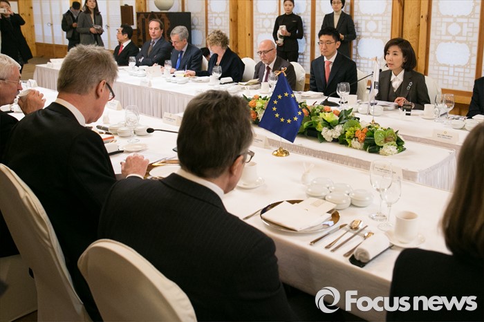 (서울=포커스뉴스) 나경원(뒷줄 오른쪽) 외교통일위원회 위원장이 21일 오후 서울 여의도 국회 사랑재에서 북한의 제4차 핵실험 후속 대책 논의를 위한 주한유럽연합(EU) 회원국 대사 초청 오찬간담회에 참석해 모두발언하고 있다.