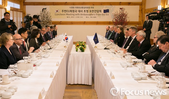 (서울=포커스뉴스) 나경원(왼쪽 네번째) 외교통일위원회 위원장이 21일 오후 서울 여의도 국회 사랑재에서 북한의 제4차 핵실험 후속 대책 논의를 위한 주한유럽연합(EU) 회원국 대사 초청 오찬간담회를 주재하고 있다.