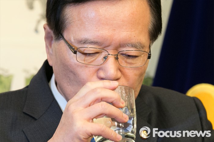 (서울=포커스뉴스) 정의화 국회의장이 21일 오후 서울 여의도 국회 접견실에서 긴급 현안 관련 기자회견 중 물을 마시고 있다.