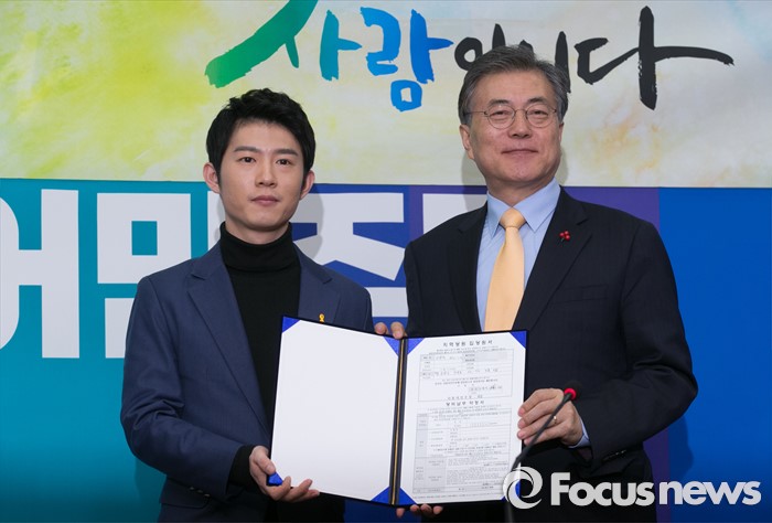 (서울=포커스뉴스) 문재인(오른쪽) 더불어민주당 대표가 21일 오후 서울 여의도 국회에서 열린 인재영입 기자회견에 참석해 세월호 참사 현장을 22일간 취재했던 부산 청년 오창석 씨로부터 전달받은 입당원서를 들고 함께 포즈를 취하고 있다.