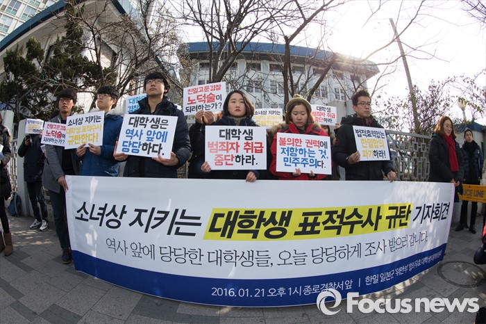 (서울=포커스뉴스) 한일 위안부 협상 폐기를 요구하며 주한일본대사관 앞 '평화의 소녀상' 인근에서 노숙 농성과 집회를 벌인 혐의로 출석요구서를 받은 대학생들이 21일 오후 서울 종로경찰서 앞에서 '소녀상을 지키는 대학생 표적수사 규탄 기자회견'을 하고 있다.