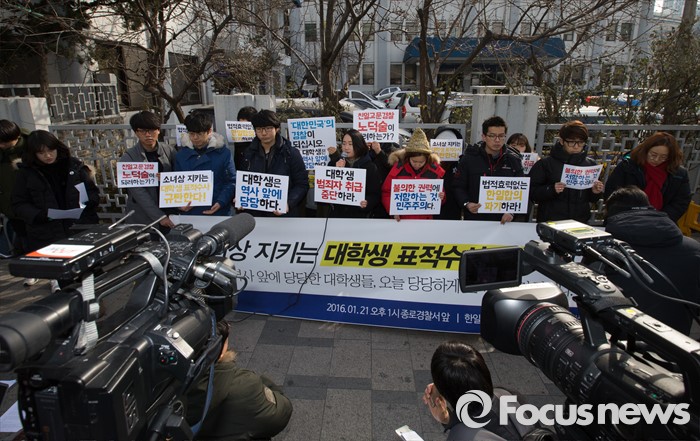 (서울=포커스뉴스) 한일 위안부 협상 폐기를 요구하며 주한일본대사관 앞 '평화의 소녀상' 인근에서 노숙 농성과 집회를 벌인 혐의로 출석요구서를 받은 대학생들이 21일 오후 서울 종로경찰서 앞에서 '소녀상을 지키는 대학생 표적수사 규탄 기자회견'을 하고 있다.