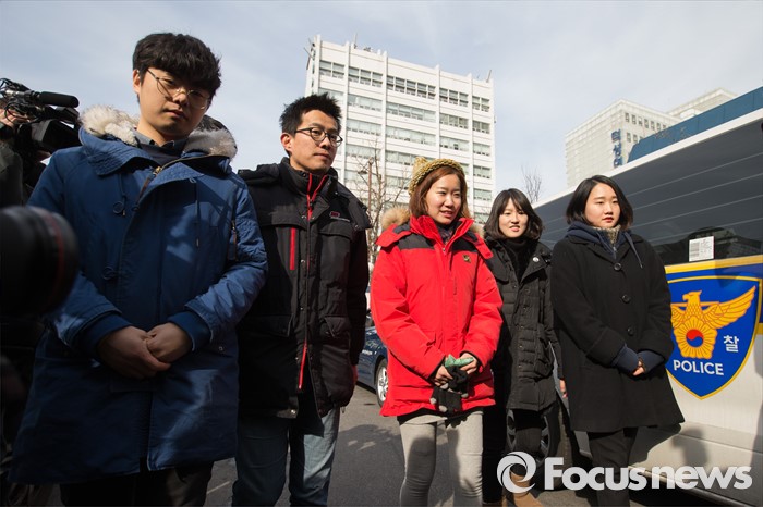 (서울=포커스뉴스) 한일 위안부 협상 폐기를 요구하며 주한일본대사관 앞 '평화의 소녀상' 인근에서 노숙 농성과 집회를 벌인 혐의로 출석요구서를 받은 대학생들이 21일 오후 서울 종로경찰서 앞에서 '소녀상을 지키는 대학생 표적수사 규탄 기자회견'을 끝내고 경찰서로 출석하고 있다.