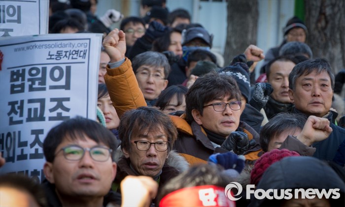 (서울=포커스뉴스) 21일 오후 서울 서초구 서울중앙지방법원 인근에서 열린 전교조 탄압 분쇄 결의대회에서 참가자들이 구호를 외치고 있다.