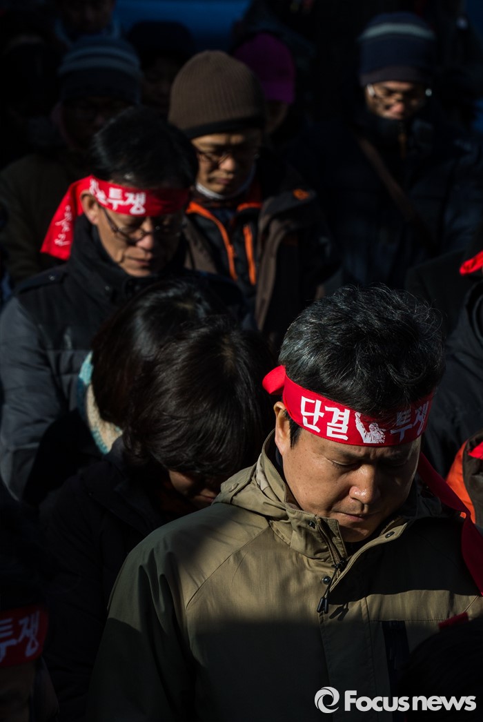 (서울=포커스뉴스) 21일 오후 서울 서초구 서울중앙지방법원 인근에서 열린 전교조 탄압 분쇄 결의대회에서 참가자들이 묵념하고 있다.