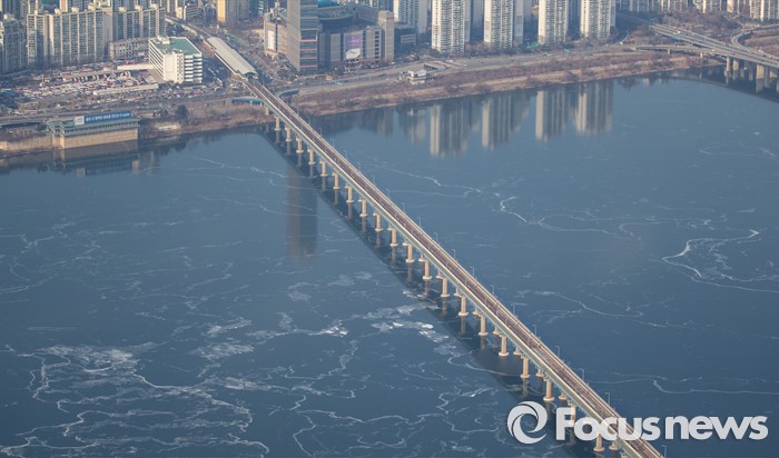 (서울=포커스뉴스) 서울 기온이 영하권에 머무르며 연일 강추위가 이어지고 있는 21일 오후 서울 한강이 얼어 있다.