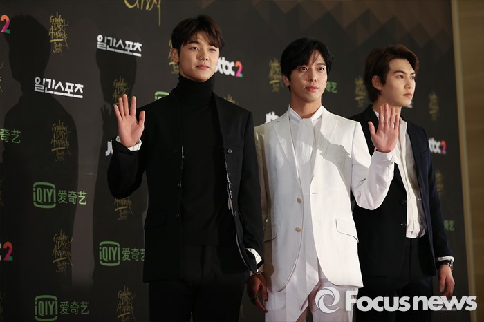 (서울=포커스뉴스) 21일 서울 동대문구 경희대학교 평화의 전당에서 열린 제 30회 골든디스크 시상식에 참석한 씨엔블루의 멤버들이 포토타임을 갖고 있다.