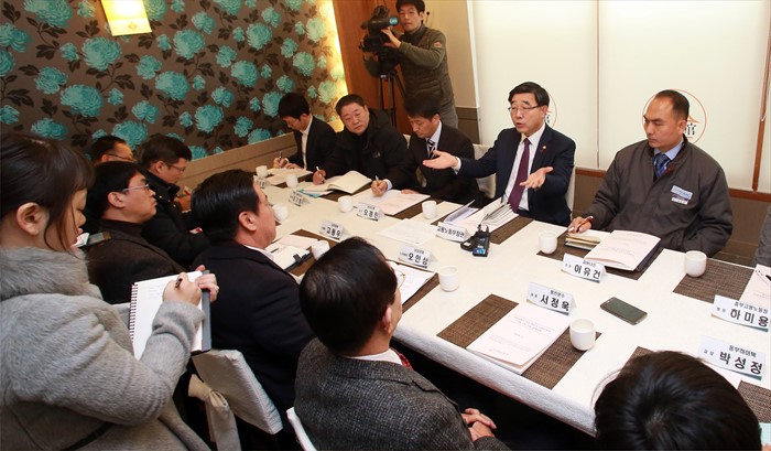 (인천=포커스뉴스) 이기권 고용노동부 장관이 21일 오전 인천 남동구 소재 식당에서 인천지역 노사간담회를 갖고, 노동개혁 관련 2대 지침에 대한 상세한 설명과 다양한 의견을 수렴하고 있다. <사진제공=고용노동부>