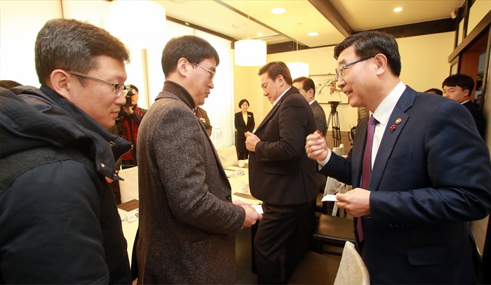 (인천=포커스뉴스) 이기권 고용노동부 장관이 21일 오전 인천 남동구 소재 식당에서 인천지역 노사간담회를 앞두고 참석자들과 악수를 하고있다. <사진제공=고용노동부>