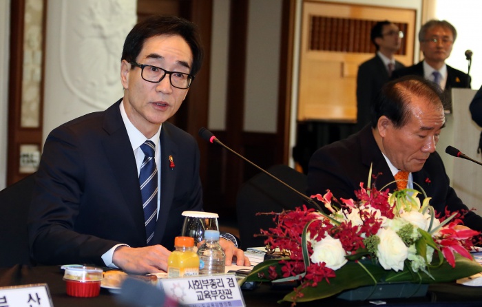 (부산=포커스뉴스) 이준식 교육부 장관이 21일 오후 부산 해운대 그랜드호텔에서 열린 전국 시·도교육감협의회 총회에 참석해 질문에 답변하고 있다. 이날 총회는 누리과정 예산 및 총회 상정 안건, 사무국 제안 안건 등을 논의했다. <사진제공=교육부>