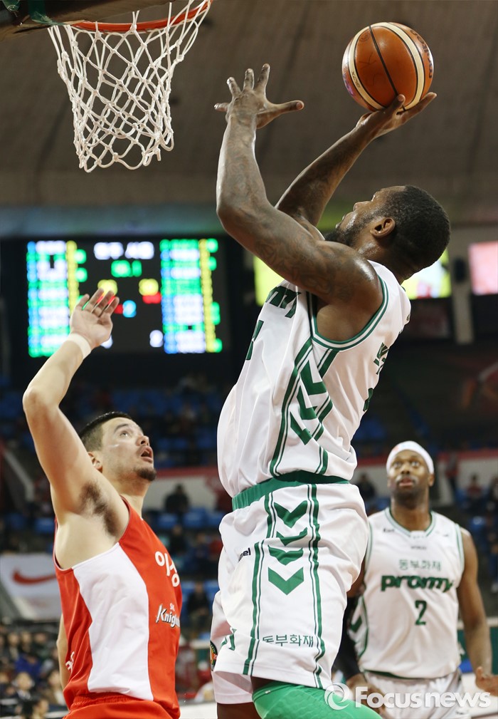 (서울=포커스뉴스) 21일 서울 잠실학생체육관에서 열린 2015-2016 프로농구 SK-동부 경기에서 동부 맥키네스가 SK 김민수를 앞에 두고 골밑슛을 시도하고 있다.