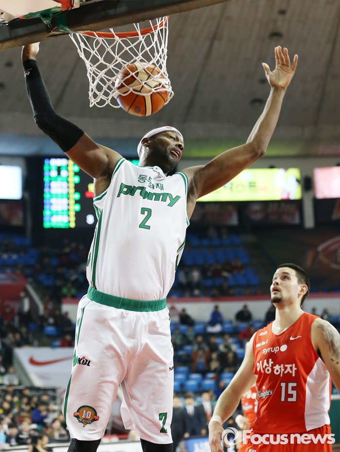 (서울=포커스뉴스) 21일 서울 잠실학생체육관에서 열린 2015-2016 프로농구 SK-동부 경기에서 동부 벤슨이 노마크 찬스에서 가볍게 덩크로 골을 넣고 있다.