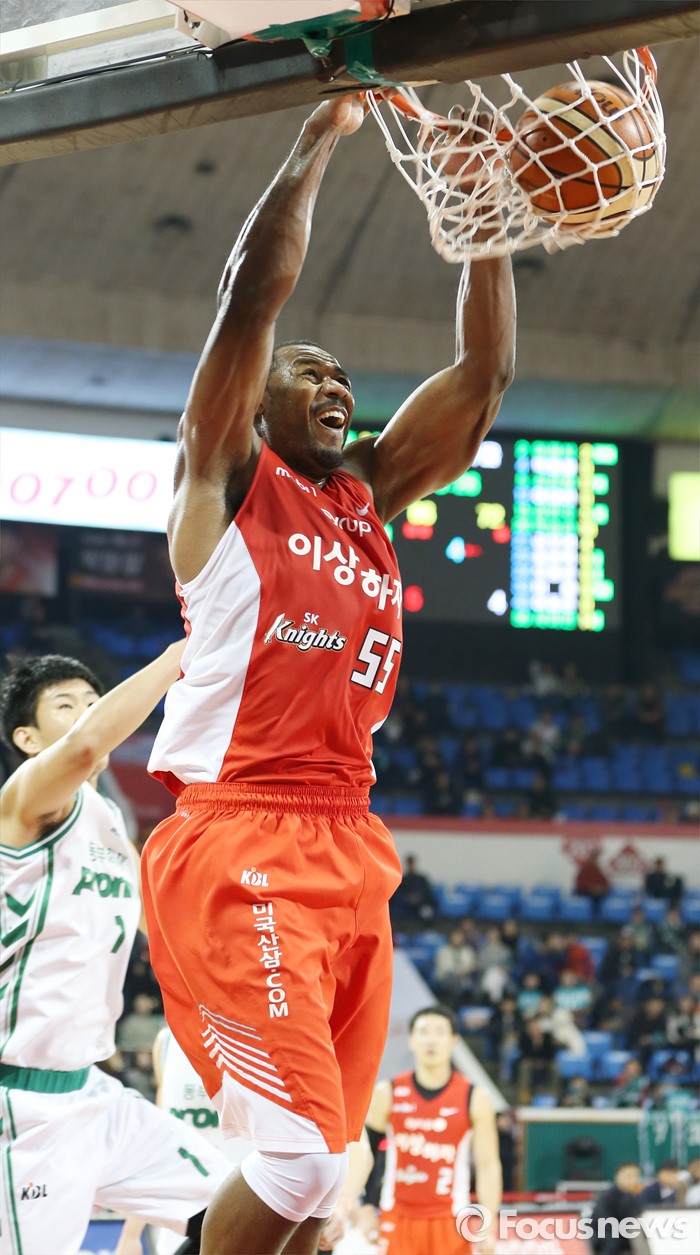 (서울=포커스뉴스) 21일 서울 잠실학생체육관에서 열린 2015-2016 프로농구 SK-동부 경기에서 SK 사이먼이 동부 한정원의 수비를 제치며 투핸드 덩크슛을 성공시키고 있다.
