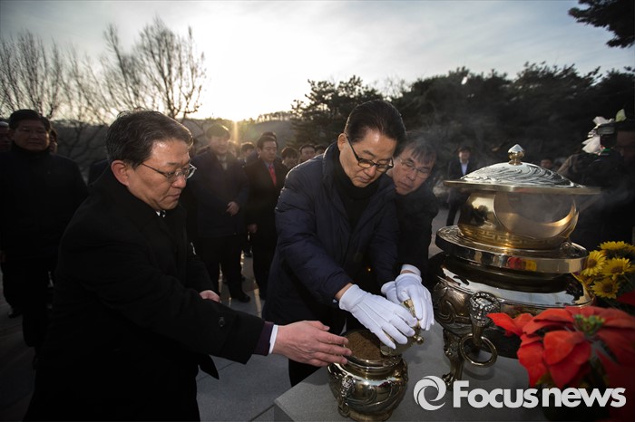 (서울=포커스뉴스) 더불어민주당 탈당을 예고한 박지원(왼쪽 두번째) 전 원내대표가 22일 오전 서울 동작구 국립서울현충원 故 김대중 전 대통령 묘역을 방문해 분향을 하고 있다
