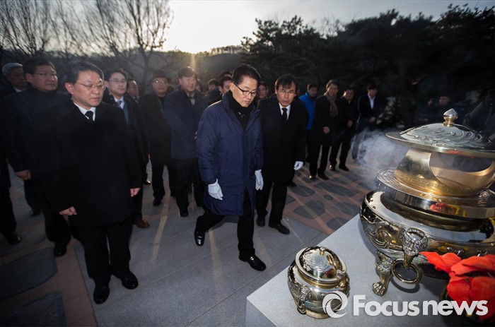 (서울=포커스뉴스) 더불어민주당 탈당을 예고한 박지원 전 원내대표가 22일 오전 서울 동작구 국립서울현충원 故 김대중 전 대통령 묘역을 방문해 참배를 하고 있다
