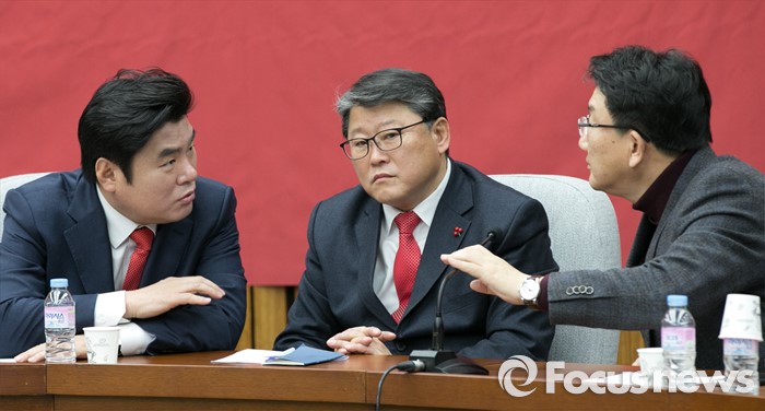 (서울=포커스뉴스) 원유철(왼쪽부터) 새누리당 원내대표와 조원진 원내수석부대표, 권성동 전략기획본부장이 22일 오전 서울 여의도 국회에서 열린 원내대책회의에 참석해 논의하고 있다.