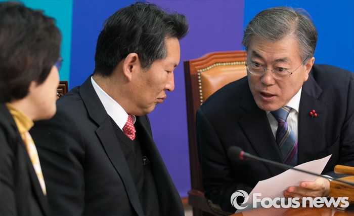 (서울=포커스뉴스) 문재인(오른쪽부터) 더불어민주당 대표와 정청래, 유승희 최고위원이 22일 오전 서울 여의도 국회에서 열린 최고위원회의에 참석해 대화하고 있다.