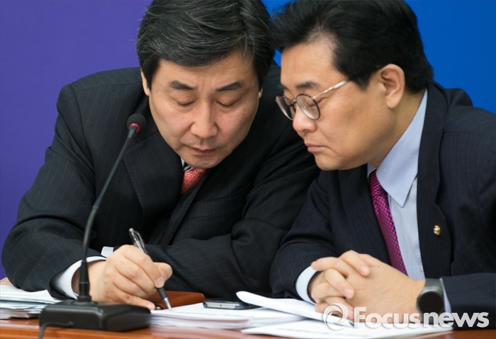 (서울=포커스뉴스) 이종걸(왼쪽) 더불어민주당 원내대표와 전병헌 최고위원이 22일 오전 서울 여의도 국회에서 열린 최고위원회의에 참석해 대화하고 있다.