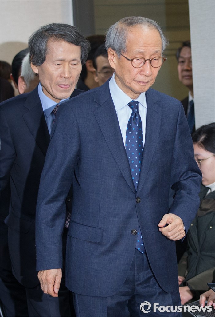 (서울=포커스뉴스) 국민의당(가칭) 창당준비위원회 위원장직을 수락한 후 2주 만에 모습을 드러낸 윤여준 전 장관이 한상진 공동 창준위원장과 함께 20일 오전 서울 마포구 국민의당(가칭) 당사에서 열리는 기획조정회의에 참석하고 있다.
