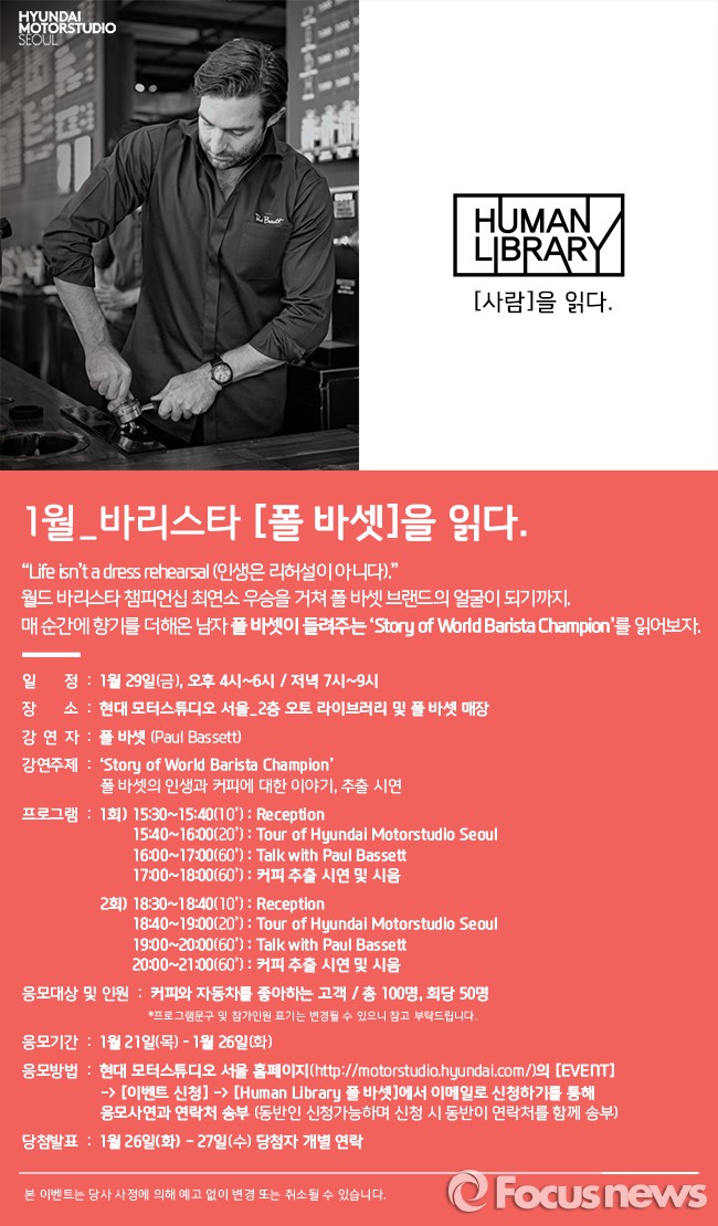 이번 강연은 매달 명사를 초청해 고객과 소통하는 시간을 갖는 현대차의 '휴먼 라이브러리' 이벤트의 일환이다. 지난 2003년 세계 바리스타 챔피언 대회에서 역대 최연소 챔피언에 오른 호주 출신 바리스타 폴 바셋은 △바리스타 챔피언이 되기까지의 이야기 △집에서 쉽게 커피를 즐기는 방법 △커피에 대한 철학과 인생 △에스프레소 추출 시연·시음 등 다양한 이야기와 볼거리를 제공할 예정이다.