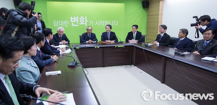 (서울=포커스뉴스) 국민의당(가칭) 창당준비위원회 위원장직을 수락한 후 2주 만에 모습을 드러낸 윤여준 전 장관이 20일 오전 서울 마포구 국민의당(가칭) 당사에서 열린 기획조정회의에 참석해 인사하고 있다. (왼쪽부터) 김한길 상임 부위원장, 윤여진 공동 창준위원장, 한상진 공동창준위원장, 주승용 의원, 안철수 인재영입위원장.