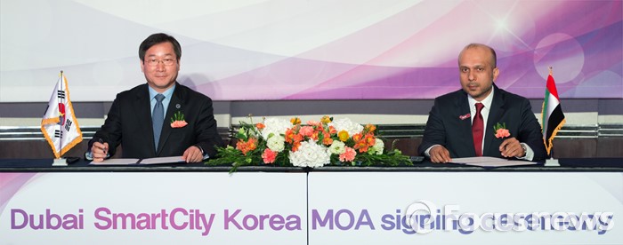 (인천=포커스뉴스) 22일 오후 인천 연수구 쉐라톤인천호텔에서 열린 검단 스마트시티 MOA 체결식에서 유정복(왼쪽) 인천시장과 자버 빈 하페즈 두바이 스마트시티 CEO가 협약서에 서명하고 있다.