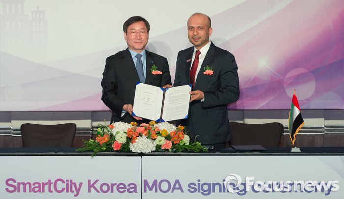 (인천=포커스뉴스) 22일 오후 인천 연수구 쉐라톤인천호텔에서 열린 검단 스마트시티 MOA 체결식에서 유정복(왼쪽) 인천시장과 자버 빈 하페즈 두바이 스마트시티 CEO가 협약서 서명 후 기념촬영을 하고 있다.