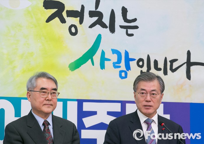 (서울=포커스뉴스) 문재인(오른쪽) 더불어민주당 대표가 22일 오후 서울 여의도 국회에서 열린 박근혜 대선 캠프 출신인 양봉민 서울대 보건학과 교수 영입 기자회견에 참석해 인사말을 하고 있다. 양 교수는 지난 18대 대선에서 새누리당이 경제민주화를 위해 구성한 국민행복추진위원회에 참여했던 인물이며, 박 대통령의 보건복지 공약을 만든 '편안한 삶 추진단'의 보건의료팀장을 맡았었다.