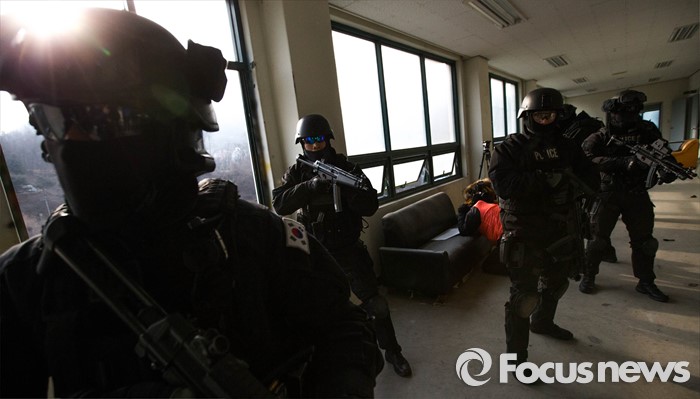 (서울=포커스뉴스) 22일 오후 서울 경찰특공대 훈련장에서 테러상황에 대비한 경찰, 소방, 군 전력이 함께 한 합동훈련이 실시된 가운데 경찰특공대 대원들이 테러범에 의한 인질상항 등을 가정한 훈련을 진행하고 있다.