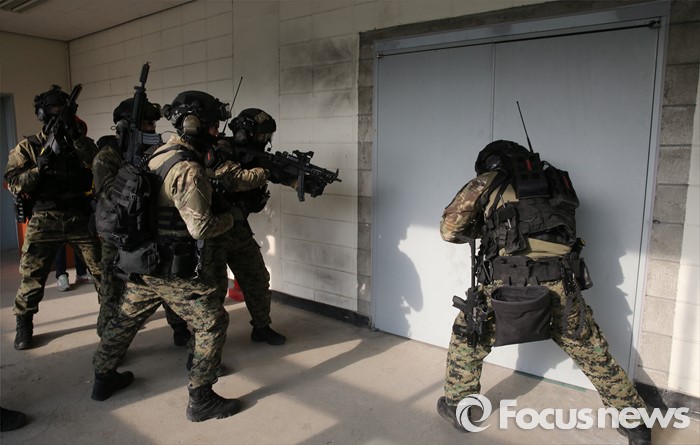 (서울=포커스뉴스) 김신조 청와대 침투사건인 ‘1·21사태’ 48주년을 맞아 서울경찰청·소방재난본부·수도방위사령부가 합동으로 수도 서울을 지키기 위한 테러 진압 훈련을 실시한 22일 서울 서초구 경찰특공대 훈련장에서 군 테러 진압 부대가 인질범 진압 작전을 펼치고 있다.