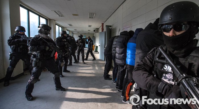 (서울=포커스뉴스) 22일 오후 서울 경찰특공대 훈련장에서 테러상황에 대비한 경찰, 소방, 군 전력이 함께 한 합동훈련이 실시된 가운데 경찰특공대 대원들이 테러범에 의한 인질상항 등을 가정한 훈련을 진행하고 있다.