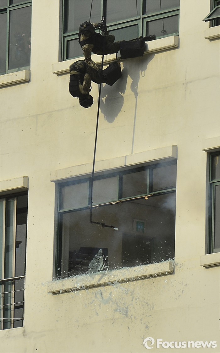 (서울=포커스뉴스) 22일 오후 서울 서초구 서울경찰특공대 훈련장에서 열린 경찰·군·소방 대테러 합동훈련에서 특공대원들이 인질범 제압 훈련을 하고 있다.