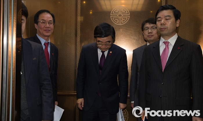 (세종=포커스뉴스) 이기권 고용노동부장관이 22일 오후 세종시 정부세종청사 보건복지부 브리핑룸에서 '일반 해고' 및 '취업규칙 변경요건 완화' 등 양대 지침에 대한 최종안 발표를 마치고 엘리베이터에서 취재진에게 인사를 하고 있다.
