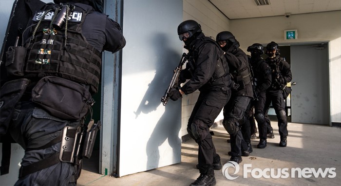 (서울=포커스뉴스) 22일 오후 서울 경찰특공대 훈련장에서 테러상황에 대비한 경찰, 소방, 군 전력이 함께 한 합동훈련이 실시된 가운데 경찰특공대 대원들이 테러범에 의한 인질상항 등을 가정한 훈련을 진행하고 있다.