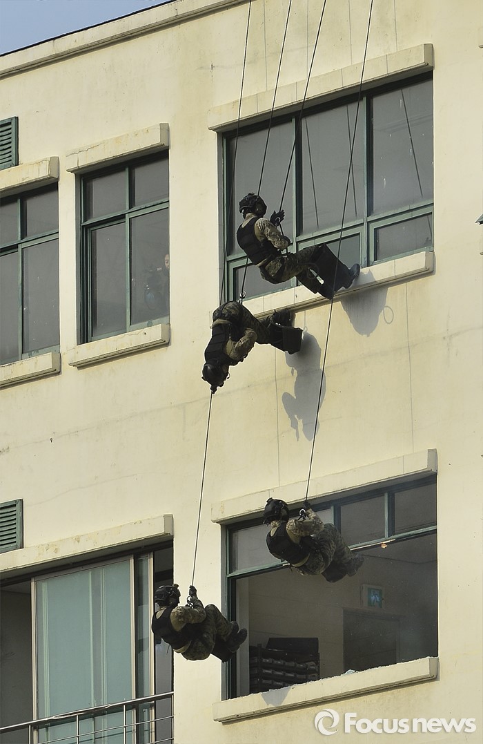 (서울=포커스뉴스) 22일 오후 서울 서초구 서울경찰특공대 훈련장에서 열린 경찰·군·소방 대테러 합동훈련에서 특공대원들이 인질범 제압 훈련을 하고 있다.