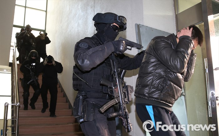 (서울=포커스뉴스) 김신조 청와대 침투사건인 ‘1·21사태’ 48주년을 맞아 서울경찰청·소방재난본부·수도방위사령부가 합동으로 수도 서울을 지키기 위한 테러 진압 훈련을 실시한 22일 서울 서초구 경찰특공대 훈련장에서 군 테러 진압 부대가 인질범 진압 작전을 펼치고 있다.