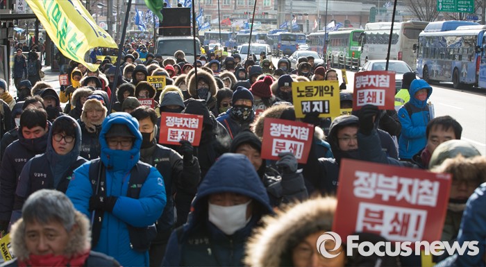 (서울=포커스뉴스) 23일 오후 서울역 광장에서 열린 '민주노총 총파업 선포대회'에서 전국민주노동조합총연맹 회원들이 도심을 향해 행진을 하고 있다.