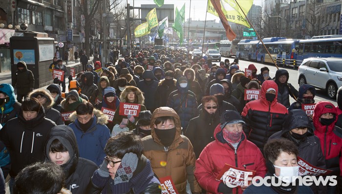 (서울=포커스뉴스) 23일 오후 서울역 광장에서 열린 '민주노총 총파업 선포대회'에서 전국민주노동조합총연맹 회원들이 도심을 향해 행진을 하고 있다.