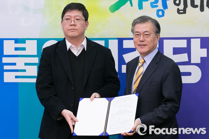(서울=포커스뉴스) 김대중 전 대통령의 삼남 김홍걸(왼쪽) 연세대 김대중 도서관 객원교수가 24일 오전 서울 여의도 국회 더불어민주당 당대표실에서 입당 기자회견을 마치고 문재인 대표와 기념사진을 찍고 있다.