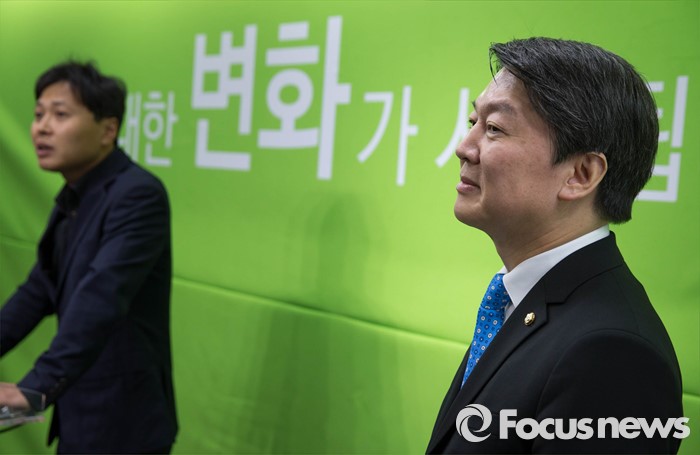 (서울=포커스뉴스) 24일 오전 서울 마포구 국민의당 당사에서 안철수(오른쪽) 인재영입위원장이 새로 입당한 곽선우 변호사의 발언을 경청하고 있다.