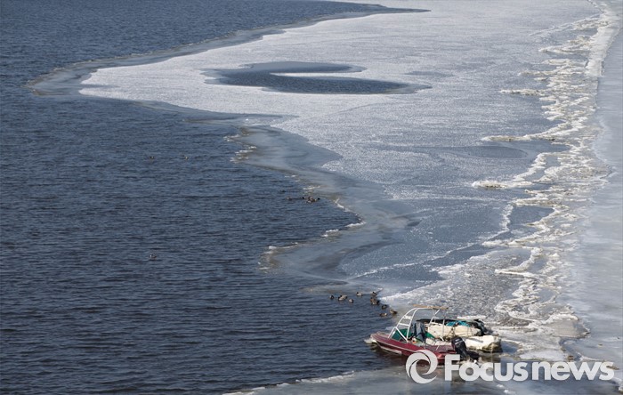 (고양=포커스뉴스) 서울 최저기온이 영하 18도, 체감온도 영하 30도를 기록한 30일 오후 경기도 고양시 행주대교 부근의 얼어 붙은 한강에 배가 정박해 있다.