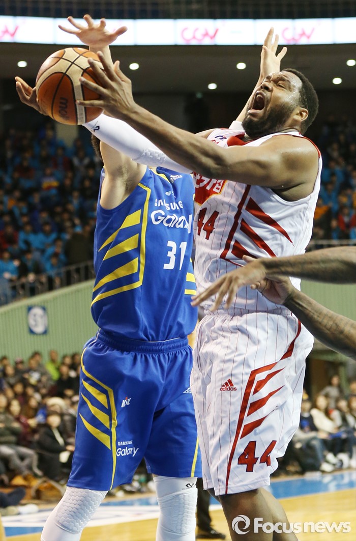 (서울=포커스뉴스) 24일 서울 잠실실내체육관에서 열린 2015-2016 프로농구 삼성-오리온 경기에서 오리온 제스퍼 존슨이 삼성 김준일의 마크를 제치며 레이업슛을 시도하고 있다.
