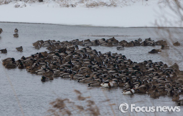 (서산=포커스뉴스) 겨울철새 청둥오리들이 25일 오전 계속되는 한파특보속에 충남 서산시 천수만에서 눈보라를 피해 서로 똘똘 뭉쳐 있다.