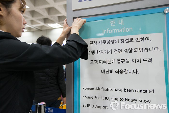 (서울=포커스뉴스) 25일 오전 서울 김포공항 국내선 청사에서 항공사 관계자가 제주와 김포로 오가는 항공편의 결항 안내문을 게시하고 있다.