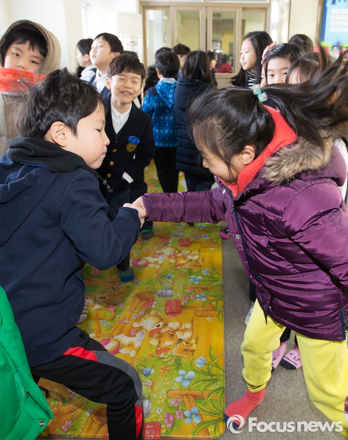(청주=포커스뉴스) 한파가 이어진 가운데 25일 오전 충북 청주 대성초등학교가 개학식을 갖고 학사일정에 들어갔다. 1학년 학생들이 힘겨루기를 하고 있다.