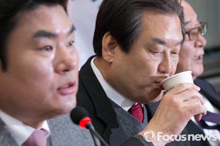 (서울=포커스뉴스) 김무성(가운데) 새누리당 대표가 25일 오전 서울 여의도 국회에서 열린 최고위원회의에 참석해, 원유철(왼쪽) 원내대표가 발언하는 동안 물을 마시고 있다.